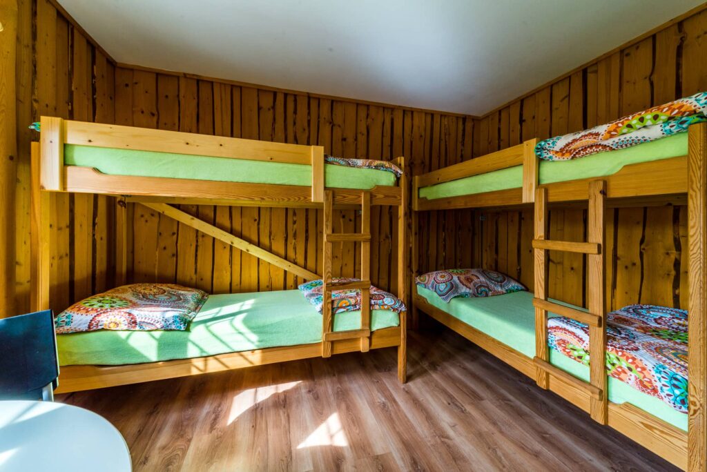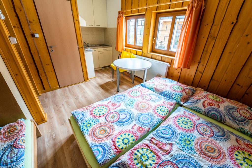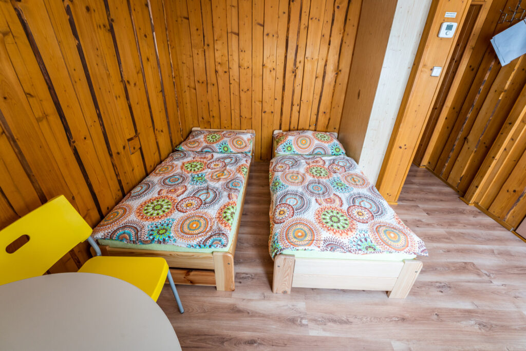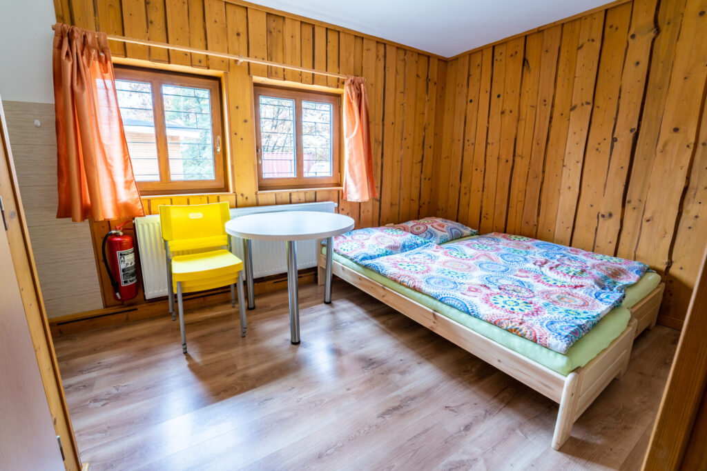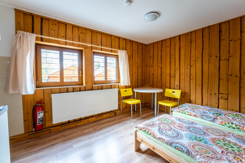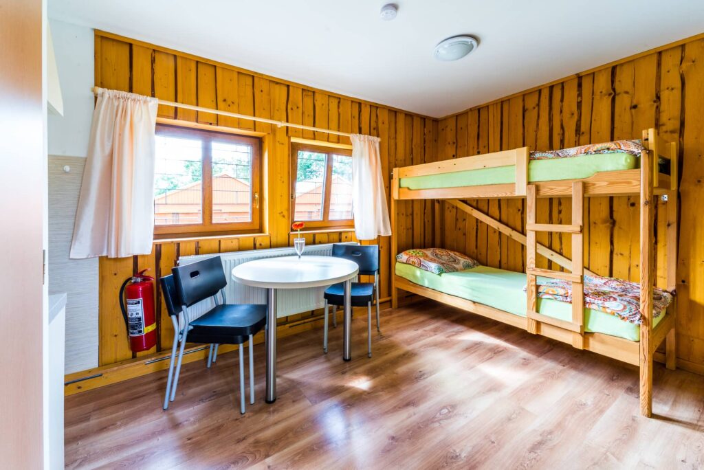 Čtyřlůžkové chatky jsou zařízeny dvěmi dvoupatrovými postelemi a také nabízíme jednu čtyřlůžkovou chatku, která má vlastní ložnici s dvěmi dvoupatrovými postelemi a v obývací místnosti je rozkládací rohová sedací souprava. Lůžkoviny a povlečení obdržíte při příjezdu na recepci. Součástí chatky je vlastní kuchyňský kout a sociální zařízení (wc, sprcha, umyvadlo). V kuchyňce naleznete varnou konvici, dvouplotýnkovou varnou desku, malou lednici, nádobí (sklenice, hrnky, talíře, příbory, misky, hrnce) a utěrku. Šatní skříň je nedílnou součástí. U každé chatky je vlastní dřevěné posezení ať už pro pohodu u kávy či večerní grilování (gril lze zapůjčit v omezené kapacitě, vlastní je výhodou). Dále doporučujeme dovést si vlastní ručníky, hygienické potřeby a toaletní papír. V bezprostřední blízkosti se nachází restaurace a kavárna. Hypermarket je vzdáleny cca 2 km. Parkování je možno při vjezdu do objektu u budovy Recepce.